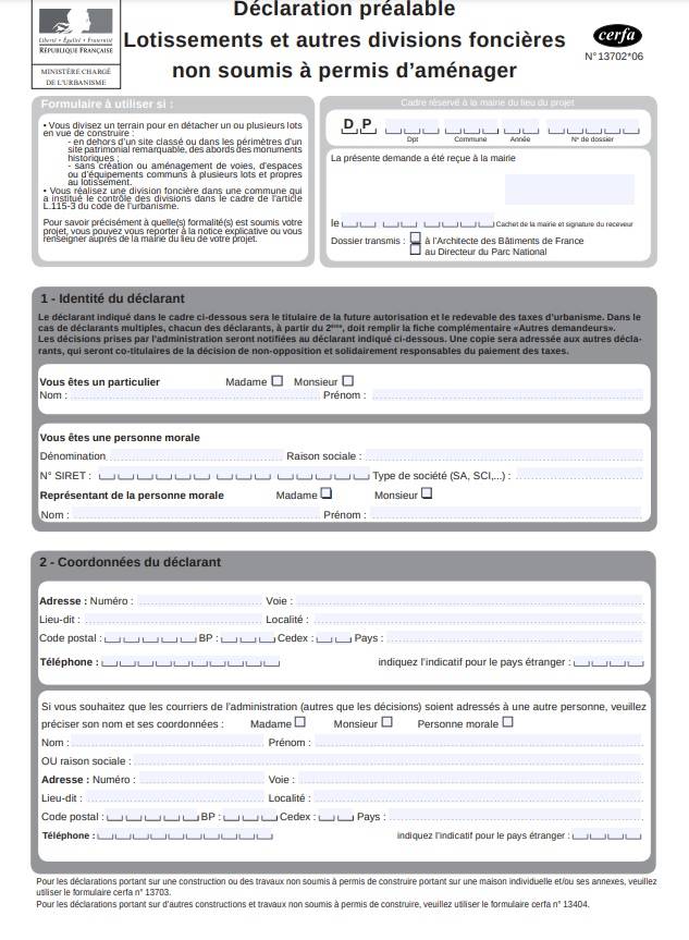 - l'établissement du dossier de déclaration préalable à la création de terrain à bâtir (lotissement)comprenant les plans DP1, DP9, DP10 et le formulaire CERFA